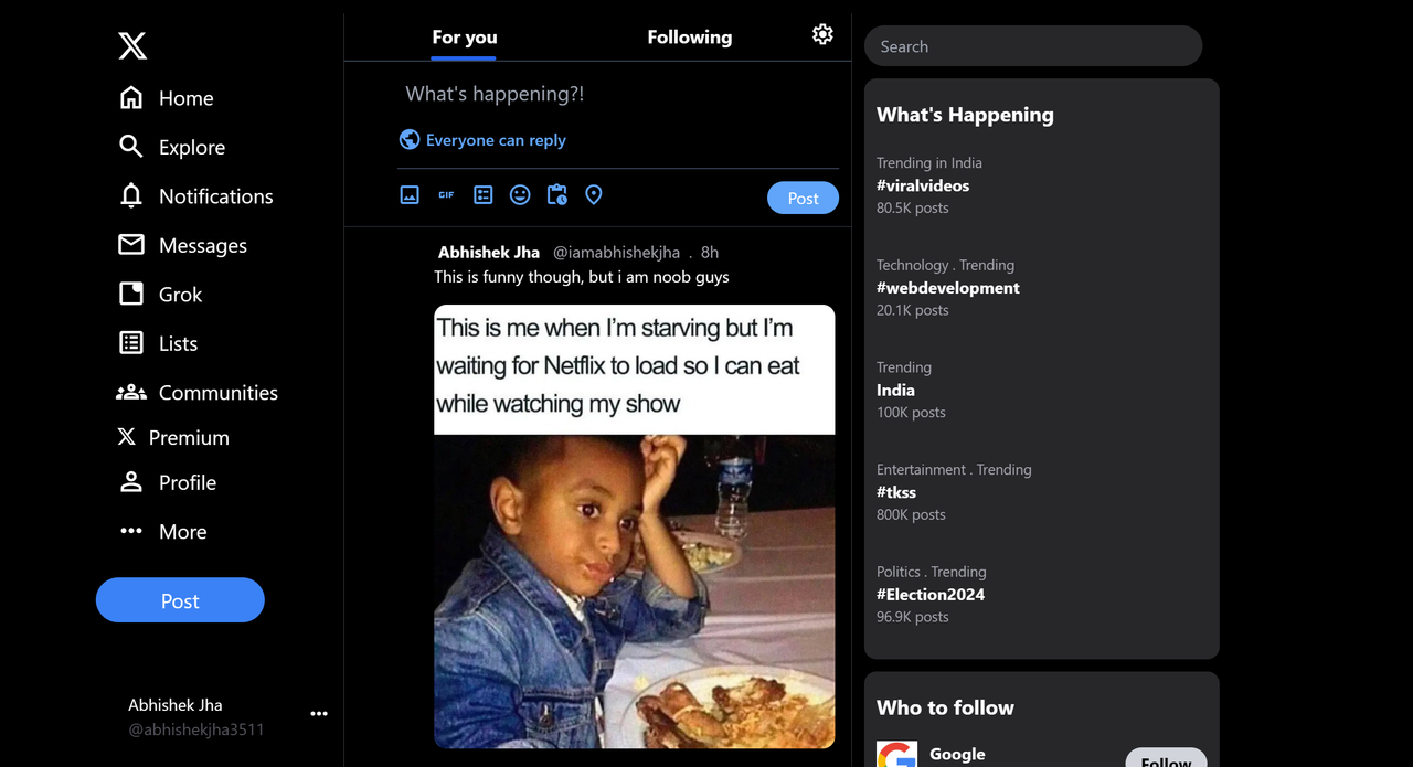 Hello World! I am Abhishek Jha from Siliguri, West Bengal, India. I am pursuing Bachelor of Computer Applications (Distance) from Uttaranchal University, Dehradun, Uttarakhand, India. While pursuing BCA I am learning Full Stack Web Development. I have understanding of web technologies and languages such as HTML, CSS, JavaScript, React, Node.js, Express.js, MongoDB, and SQL. I am always eager to learn new technologies and I am always looking for new opportunities to grow and improve my skills.